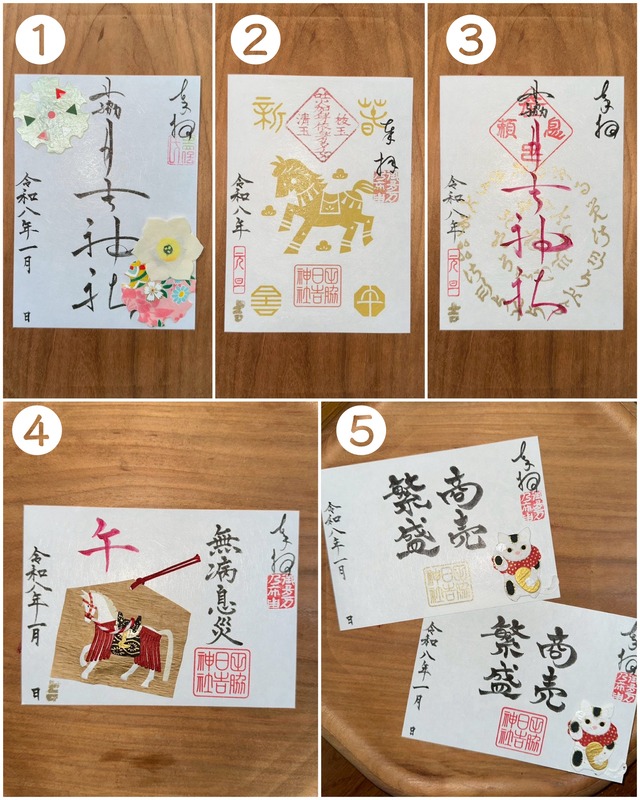 【新年御朱印】 1月頒布の御朱印です。 ①香り御朱印 水仙 初穂料1,000円 ②干支御朱印 初穂料1,000円 ③呪文御朱印 初穂料1,000円 ④神馬絵馬御朱印 初穂料1,000円 ⑤商売繁盛招き猫御朱印初穂料1,000円 正月限定の金の吉印が押印されるのは三が日のみ。以降は赤の吉印になります。 二月からは吉印は付きません。 ※メッセージを三が日までに頂いた方は金印でお届けします。