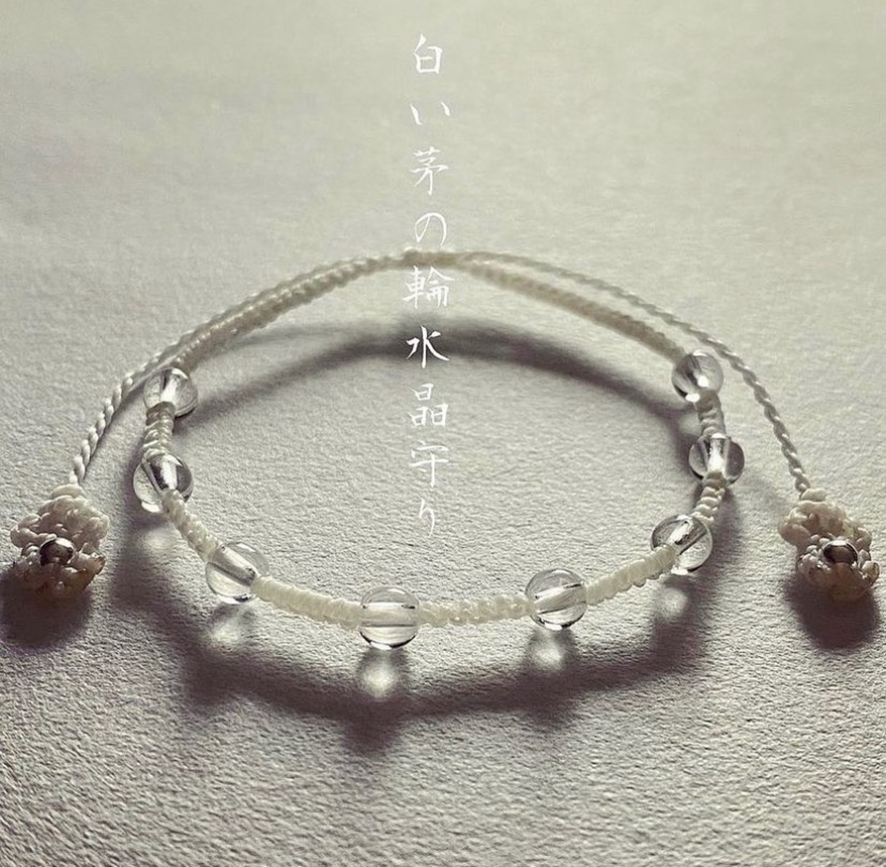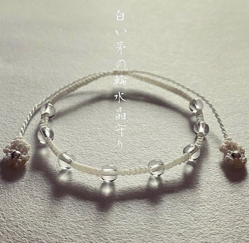 白い茅の輪水晶守りは、通常の水晶守りと重ね付けしやすい細身の編み方です。